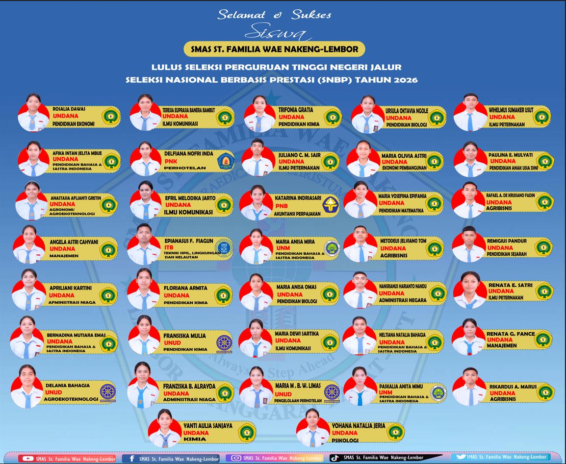 Selain fokus pada ujian, prestasi membanggakan juga diraih oleh angkatan ini. Berdasarkan pengumuman Seleksi Nasional Berdasarkan Prestasi (SNBP) 2026, sebanyak 37 siswa SMAS St. Familia Wae Nakeng – Lembor resmi dinyatakan lulus ke berbagai Perguruan Tinggi Negeri (PTN) ternama di Indonesia, menempatkan sekolah ini di posisi kedua dengan lulusan terbanyak di Kabupaten Manggarai Barat.
